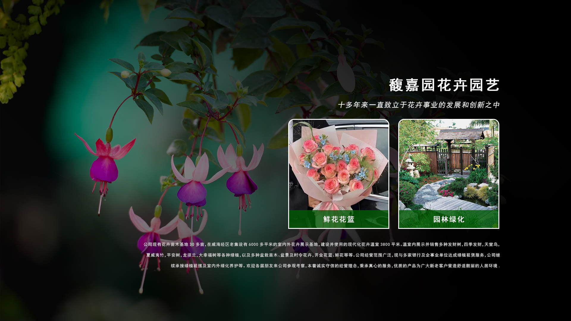 公司現有花卉苗木基地30多畝,在威海經區老集設有6000多平米的室內外花卉展示基地,建設并使用的現代化花卉溫室3800平米